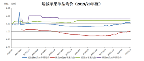 纸袋75苹果均价报1.70元/斤,较1月6日持平;纸袋80及85苹果均价报1.80元/斤,较1月6日持平。